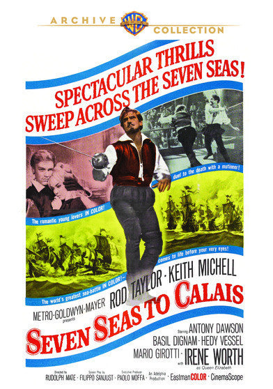 Make ready the topsails! Australian-born leading man Rod Taylor portrays English seafaring captain Sir Francis Drake in this sword-clanging, swashbuckling adventure told in bold, colorful strokes that includes Drake's circumnavigation of the globe, a mutiny at sea, raids that brought England a wealth of Spanish gold, Spain's foiled scheme to supplant Queen Elizabeth (and replace her with Mary of Scotland) and Drake's daring battle-at-sea gambit that left the mighty Spanish Armada in ruins. Three-time Tony Award-winning Broadway legend Irene Worth essays the role of politically crafty Elizabeth, who convinces Spanish ambassadors that she loathes Drake's privateering while secretly financing him. In the same month that Seven Seas to Calais was released in the U.s., Taylor would find more onscreen foes - this time not at sea but in the air, when he starred in Alfred Hitchcock's memorable The Birds.