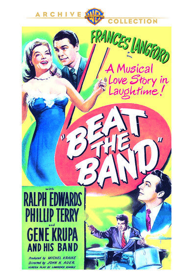 Ann Rogers is a lovely young opera student who would rather croon a mellow swing tune. Handsome Damon Dillingham is her classical voice instructor, although he's really the former leader of a swell big band, and he needs Ann's tuition money to reunite his group for a nightclub gig that follows appearances by Gene Krupa and his band. Can Ann and Damon reveal their true selves, work through misunderstandings and mixed-up feelings, and find romantic and musical bliss? Swing's the thing for Frances Langford (beloved by World War II GIs for her performances overseas with Bob Hope's USO Tours) as she portrays Ann in Beat the Band. Phillip Terry (The Lost Weekend) plays Damon, Ralph Edwards (TV's This Is Your Life) provides comedy fun as a scheming band rep and Gene Krupa isn't just on the nightclub's bill -- he's in the movie with a red-hot "Shadow Rhapsody" and more.