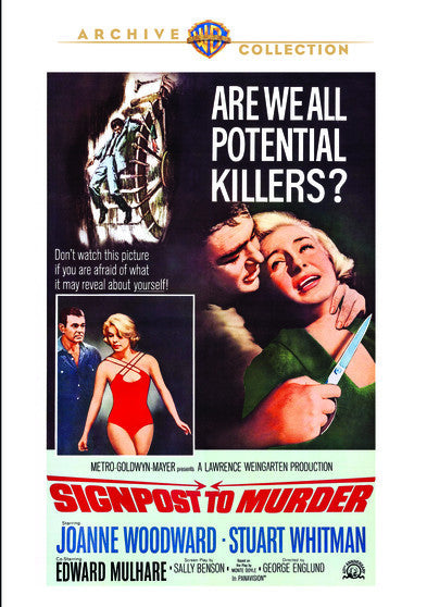 Confined to a mental institution for killing his wife, Alex Forrester (Stuart Whitman) learns from his doctor (Edward Mulhare) of an arcane law that guarantees escaped patients new trials. Believing he's no longer insane, Alex breaks out of the asylum and hides in the home of Molly Thomas (Joanne Woodward), a married woman who lives nearby. So when her husband's body is found in the woods and the police assume he's the killer, Alex must find a way to prove he's sane and innocent of the murder. An ingenious thriller packed with clever twists and turns, Signpost to Murder is based on the 1962 London stage play by Monte Doyle, which ran 419 performances and starred Margaret Lockwood as Molly.