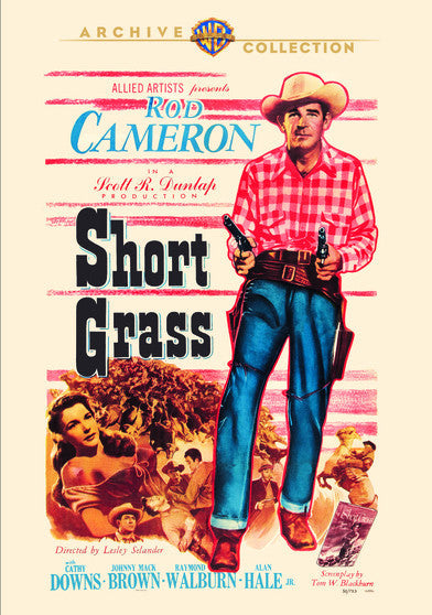 Steve Llewellyn hung up his guns after killing a man in self-defense, left Willow Creek and went on the drift for five years. Now he's back. And the bad blood stirred up by his return and the violence caused by a cattleman's grab for all the good grasslands mean Steve must strap on his sidearms again. Rod Cameron -- who became a marquee draw with a pair of espionage serials in the 1940s and went on to establish himself as a popular cowboy star -- makes Steve a hero to reckon with in Short Grass, one of the actor's 10 films with busy shoot-'em-up director Lesley Selander. Johnny Mack Brown, a sagebrush stalwart in his own right, plays the marshal who allies with Steve. Adding to the Western pedigree is costar Cathy Downs, who plays the title role in the iconic My Darling Clementine. Buffs will note other familiar faces, including Alan Hale, Jr., well remembered as the skipper who takes a "three-hour tour" to Gilligan's Island.