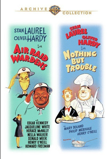 Whether serving their country in wartime or serving multicourse mealtime mayhem, Laurel and Hardy serve up laughs in this classic twofer. First, the nation calls out in its hour of need, Stan and Ollie answer...and Uncle Sam changes his mind. Rejected by the military, our heroes become Air Raid Wardens. Lights-out laughs include a donnybrook with slow-burn comic Edgar Kennedy and a run-in with a nest of spies. In Nothing but Trouble, the boys fuss and finagle as World War II-era domestics who rally 'round an exiled boy king when danger arises. Sam Taylor, codirector of Harold Lloyd's famed hanging-from-the-clock-high-above-city-traffic movie Safety Last!, guides this romp that includes a gem of a ledge-hanging sequence. Hold tight for fall-down-funny fun.