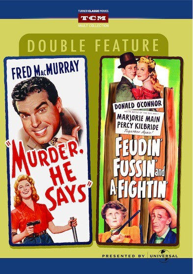 Murder, He Says and Feudin', Fussin' and A-Fightin' make their DVD debut in this new double feature available exclusively from the TCM Vault Collection. MURDER, HE SAYS (1945) Mild-mannered Trotter Polling Company employee Pete Marshall (Fred MacMurray) is sent down the back roads and into the backwoods in search of a missing fellow employee. Featuring Marjorie Main (Ma and Pa Kettle) in an unforgettable over-the-top performance, this fast-paced farce is in the grand tradition of Arsenic and Old Lace (1944). FEUDIN', FUSSIN' AND A-FIGHTIN' (1948) Donald O'Connor headlines this musical comedy co-starring Marjorie Main and Percy Kilbride (Ma and Pa Kettle). When hair tonic salesman Wilbur McMurty (O'Connor) getscaught up in a rivalry between two frontier towns, he finds himself coerced into being the front runner for Rimrock in their annual footrace against Big Bend.