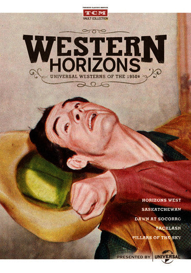 Turner Classic Movies and Universal Studios Home Entertainment proudly present Western Horizons: Universal Westerns of the 1950s, an unprecedented collection of five big-budget, Technicolor Westerns featuring many of the finest actors and directors the genre has ever known. Presented for the first time on DVD, these five films have been re-mastered to their original Technicolor glory. HORIZONS WEST (1952) Robert Ryan and Rock Hudson star as brothers on opposite sides of the law in post-Civil War Texas. Neil Hammond (Hudson) returns from the war to his life of ranching, while older brother Dan (Ryan) returns with ambitions as outsized as the Lone Star State. When Dan loses his business seed money to gambler Cord Hardin (Raymond Burr), he turns to rustling. But ill-gotten gains prove tenuous, and Dan's empire begins to crumble when brother Neil is named the new Marshall. Directed by Budd Boetticher, the film boasts a stellar supporting cast. SASKATCHEWAN (1954) AlanLadd and Jay Silverheels (television's Tonto) are blood brothers whose bonds are tested when marauding Sioux Indians cross the border to enlist the peaceful Cree in a battle against the Great White Father. Canadian Mountie Thomas O'Rourke (Ladd) and hismen must lead the sole survivor of a Sioux massacre, Shelley Winters, to safety across the border in Montana. Director Raoul Walsh and cinematographer John F. Seitz set the tense tale against a stunning widescreen, Technicolor vision of the Canadian Rockies. DAWN AT SOCORRO (1954) This spin on the oft-filmed Gunfight at the O.K. Corral stars Rory Calhoun as cardsharp Brett Wade, whose friendship with sibling peacekeepers Harry (James Millican) and Vince McNair (Scott Lee) puts him in the crosshairs of outlaw Tom Ferris (Stanley Andrews) and his three sonsincluding the fierce and vengeful Earl (Lee Van Cleef). Piper Laurie plays a saloon girl Wade aims to save along the way in this action-packed Technicolor adventure directed by George Sherman. BACKLASH (1956) Hard-bitten wanderer Jim Slater (Richard Widmark) rides the range seeking to avenge his father's death. Along the way he meets frontier widow Karyl Orton (Donna Reed), who is being hunted by gunslinger Johnny Cool (William Campbell). The unlikely duo endures various hardships as Slater comes to suspect his father died from something more sinister than an apparent Apache ambush. Director John Sturges (who would later helm Bad Day at Black Rock and The Magnificent Seven) lends this serpentine tale of revenge a heavy does of atmosphere. PILLARS OF THE SKY (1956) First Sergeant Emmett Bell (Jeff Chandler) faces off with Apache chieftain Kamiakin (Michael Ansara) in this nuanced portrayal of racial tensions between Native Americans and white settlers in 1860s Oregon Country. Bell must lead his men and civilian charges (including Dorothy Malone and Ward Bond) on a mad dash to federal sanctuary. Directed by George Marshall (Destry Rides Again, How the West Was Won), this tale of frontier survival is truly an action thriller set against widescreen western horizons.